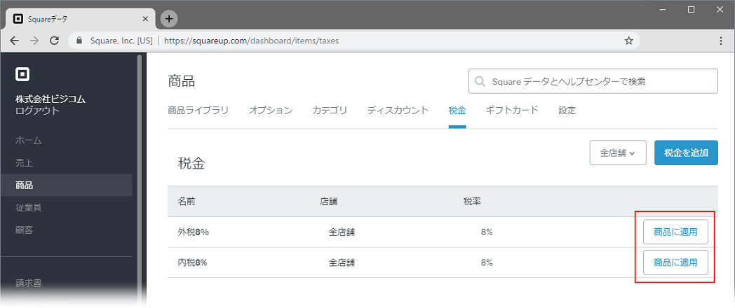 Squareデータで、全店舗の税金設定を行ってください(SquarePOSレジでの設定不可)