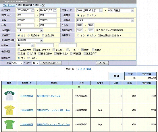 結果画面の上部に「全体」「日別」「月別」「曜日・時間別」「売上一覧」「商品ベスト」「在庫一覧」へのリンクボタンを追加しました。画面で指定している期間、店舗を引き継いで各画面に移動します。