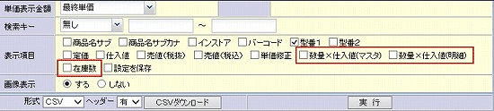 表示項目に数量×仕入値(マスタ) 、数量×仕入値(明細) 、在庫数を追加しました。チェックすると結果画面に該当商品の内容を計算して表示します。CSVにも同様に出力されます。