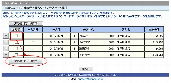 まだ配信されていない本日処理したばかりの仕入伝票が表示されます。配信したい伝票にチェックを入れて「ダウンロードデータ作成」ボタンを押してBCPOSへの仕入データを配信します。